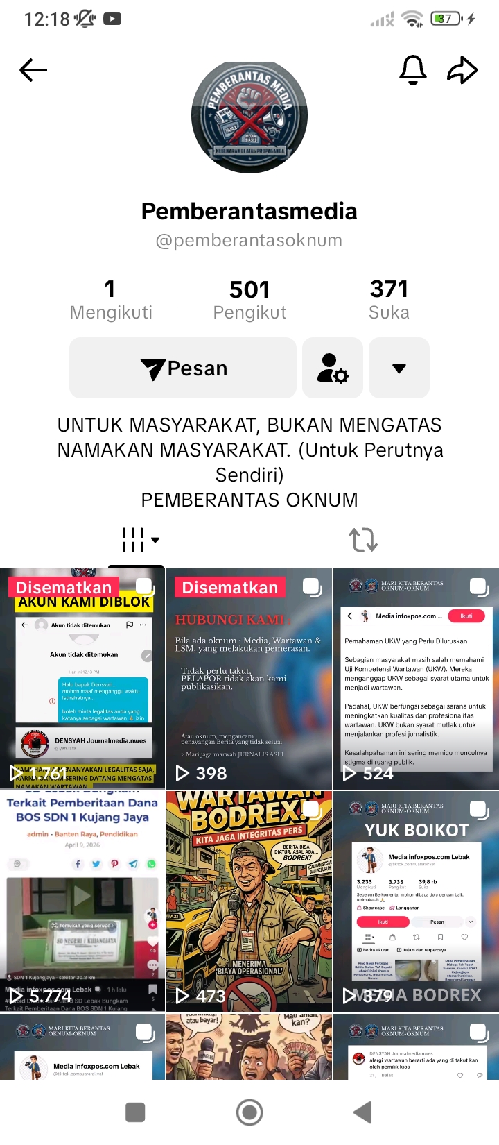 Lebak Banten Lintasbatas.com : Sebuah akun media sosial TikTok dengan nama @pemberantasoknum diduga telah mengunggah konten yang menjelek-jelekkan wartawan dan Lembaga Swadaya Masyarakat (LSM). Konten tersebut dinilai mencederai profesi jurnalis serta berpotensi merusak kepercayaan publik terhadap kerja-kerja pers. 18/04/2026.